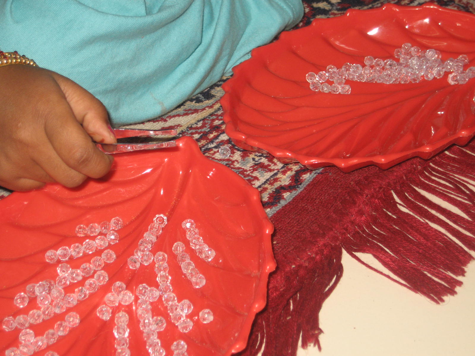 பாசியை ஒரு தட்டிலிருந்து மறு தட்டிற்கு மாற்றச் சொன்னேன். தீஷு விருப்பமாக செய்தாள். தட்டு இலை வடிவில் இருந்தது. இலையின் நரம்புகள் போல் கோடுகளும் இருந்தன. அவளாகவே அந்த கோட்டின் மேல் வைத்துக் கொண்டே வந்தாள். அவள் ஆர்வத்தைத் தக்க வைத்தது.